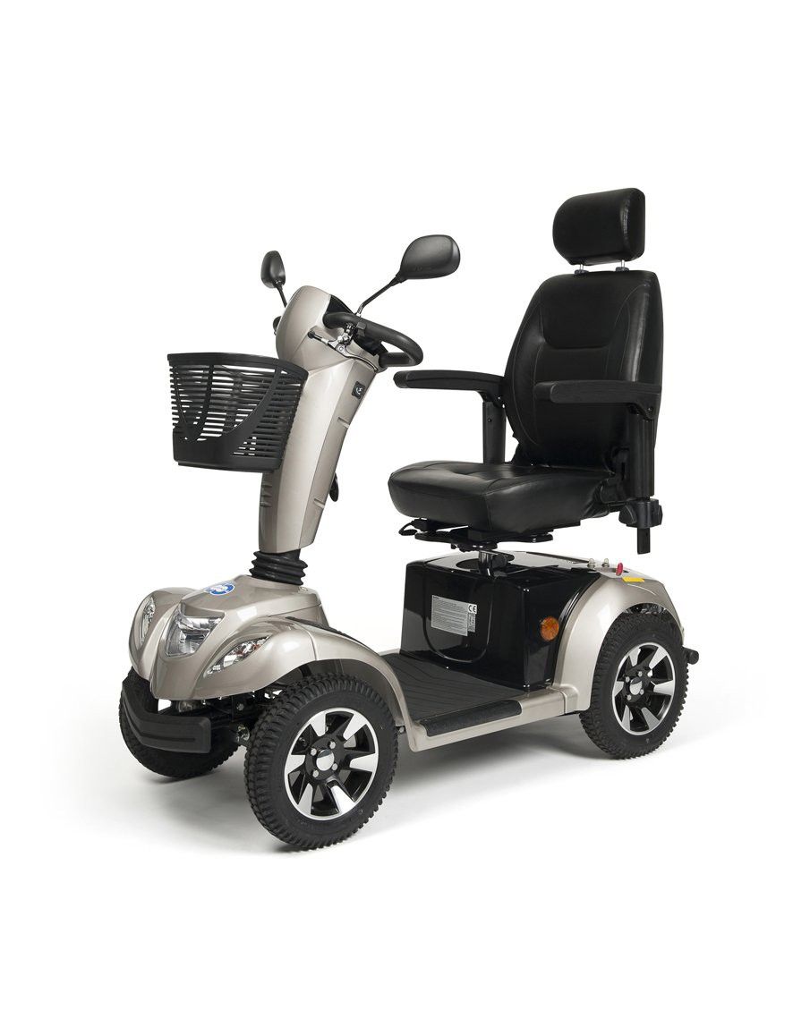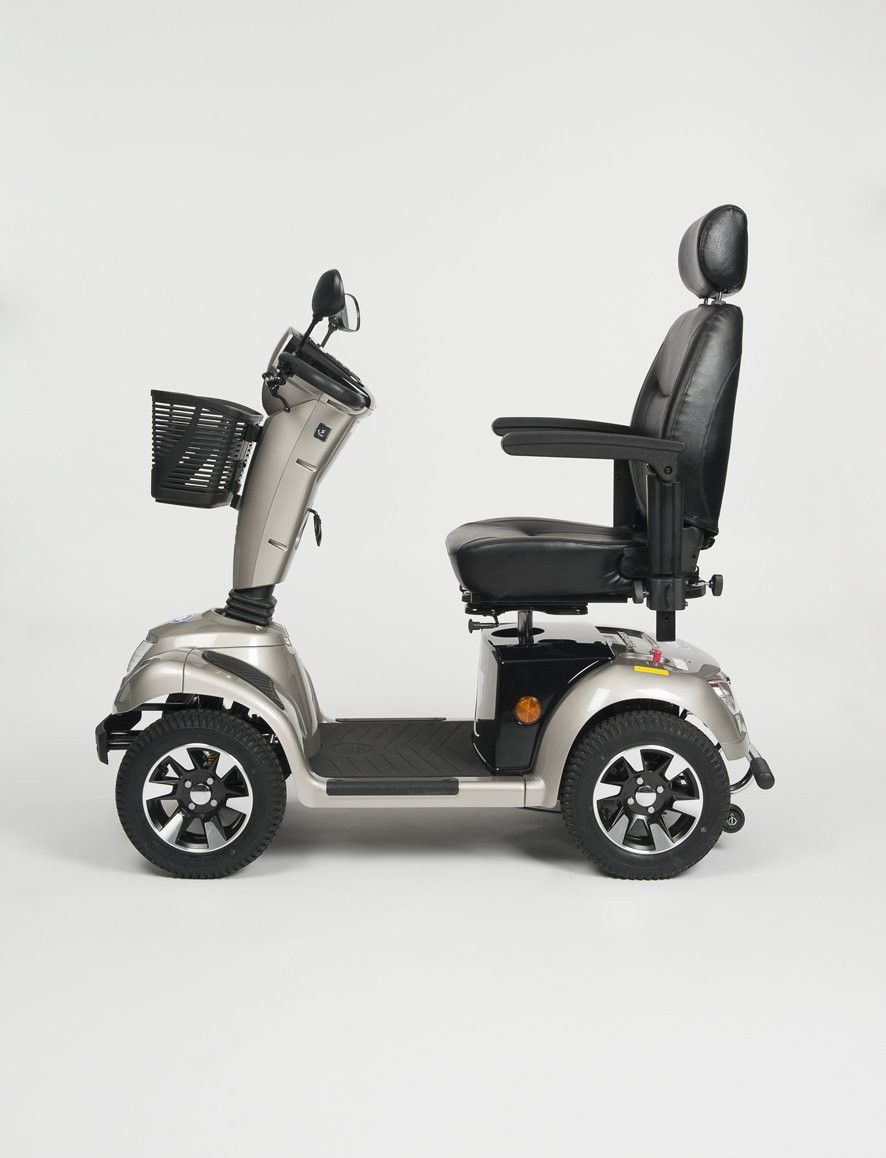Кресло-скутер с электроприводом ) Vermeiren Carpo 4 может преодолевать значительные расстояния. Но также легко его можно использовать для передвижений по помещениям, например, в больших магазинах, торговых центрах. У этой модели большие проходимые колеса. На регулируемой рулевой колонке располагается блок управления. Там же можно увидеть состояние заряда аккумулятора и скорость. Фары, скорость и поворотники регулируются кнопками. Сиденье скутера очень удобное. В нем комфортно находиться долгое время. Спереди скутера располагается фара, которая позволяет пользоваться устройством в темное время суток. Все модели выполнены из материалов высокого качества и прослужат долгое время.