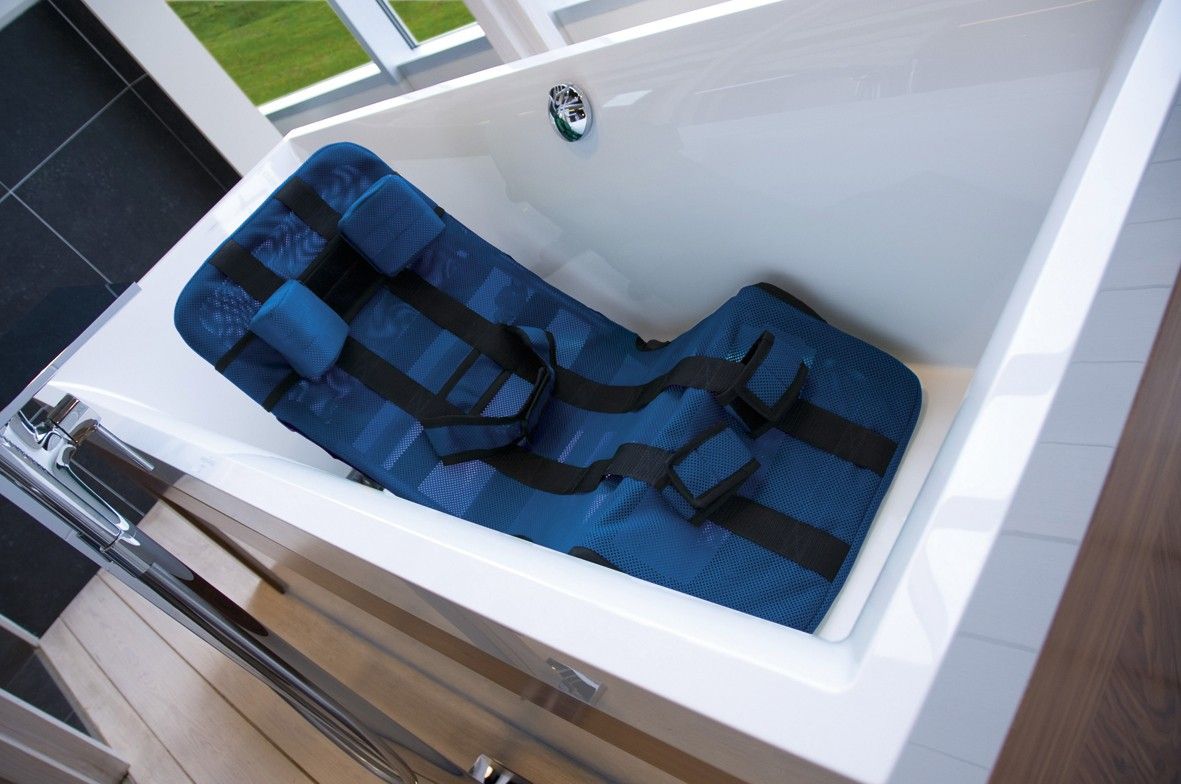 Складывающиеся сиденье-гамак для купания ребенка, имеющего нарушения опорно-двигательной функции. На алюминиевую раму натянут сетчатый гипоаллергенный материал, отлично пропускающий воду и быстро сохнущий. Чтобы правильно зафиксировать ребенка, конструкция оснащена ремнями и подголовниками, которые можно отрегулировать. Сиденье ставится в ванную на прорезиненных накладках. Оно не скользит. Вы сможете легко подобрать необходимую высоту и ширину для подголовника. Угол наклона спинки также удобно регулируется. Ремни на липучках надежно зафиксируют грудную клетку и ноги. Ребенку обеспечивается безопасность, а мама получает свободу рук, а ее позвоночник не нагружается.